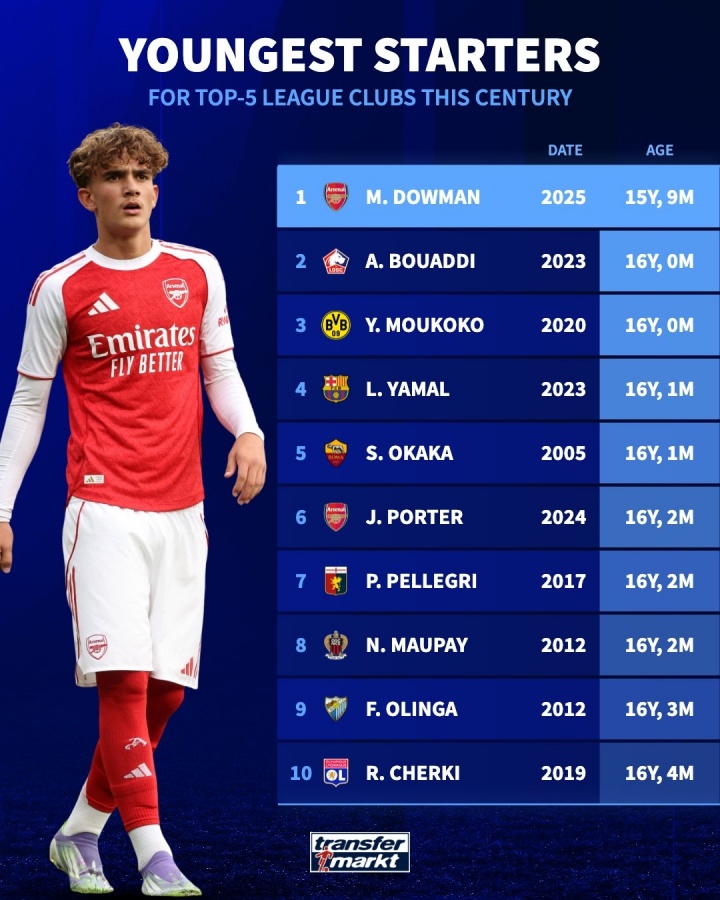1-道曼(阿森纳)2025年,15岁零9个月