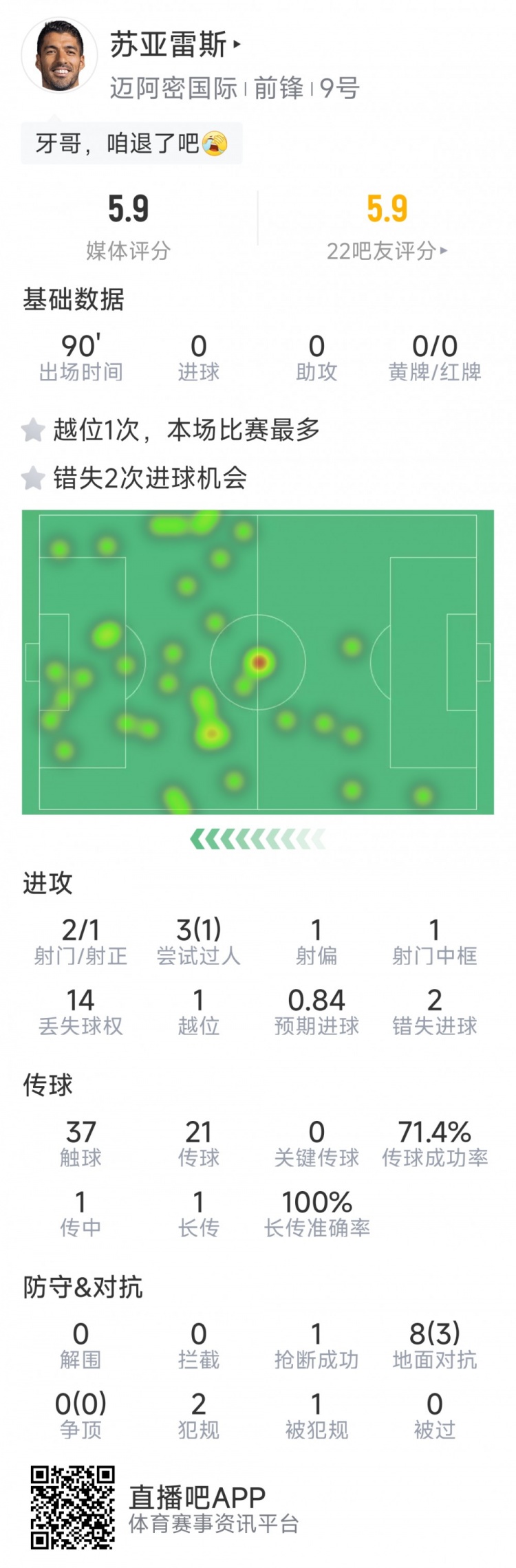 2025-11-02 16:32:50苏亚雷斯本场数据:2次错失良机,1次中柱,评分5.9分全场最低
