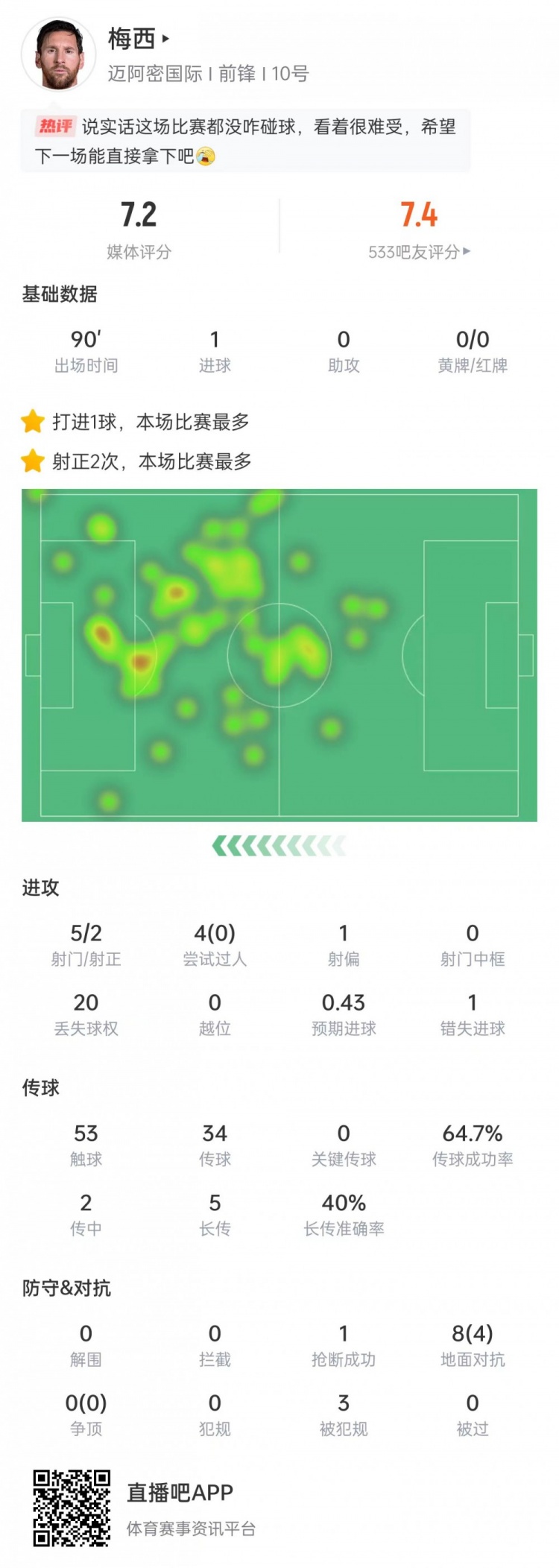 梅西数据:射门5次打进1球,4次过人0成功+20次丢球权,获评7.2分